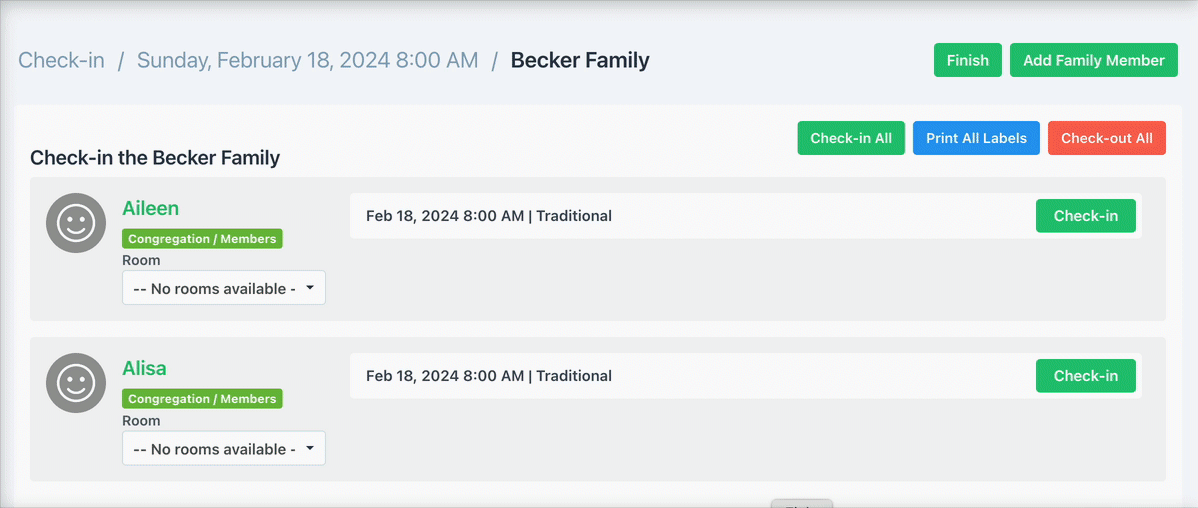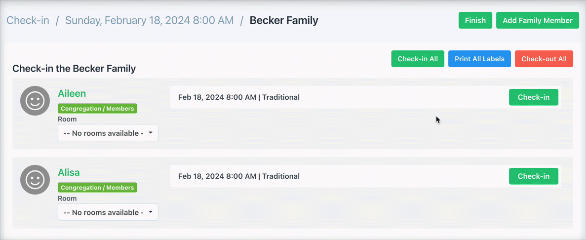 - Click Check-In next to each child that you would like to check in or select Check-In all at the top of the screen