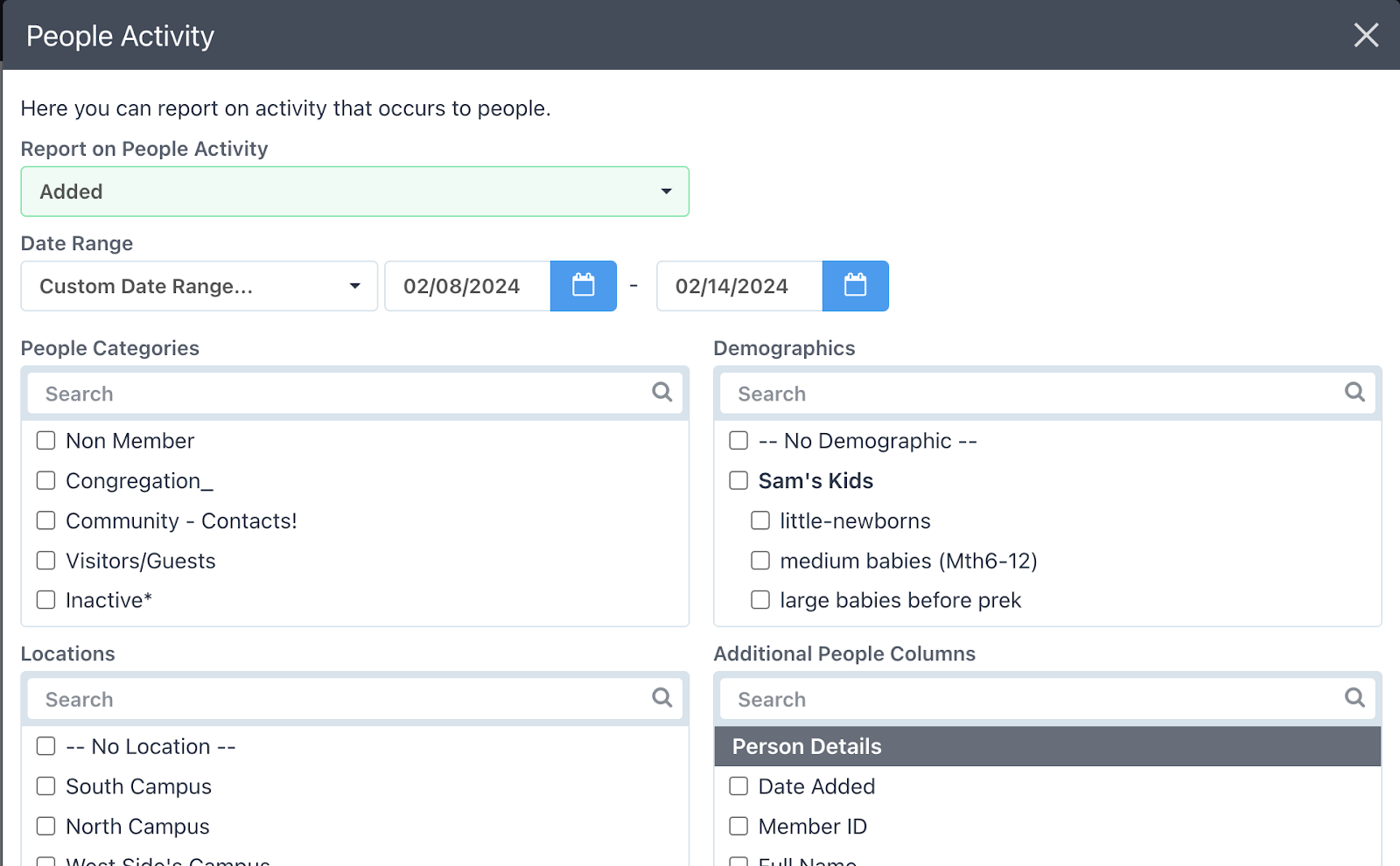 This article will guide you through the steps of using the People Activity Report feature in Elvanto. Whether you're tracking individual activities or analyzing trends over time, this tool offers valuable insights into your organization's interactions. Learn how to customize your reports by selecting specific activities and filtering criteria, and enhance your analysis by adding additional fields to your report.