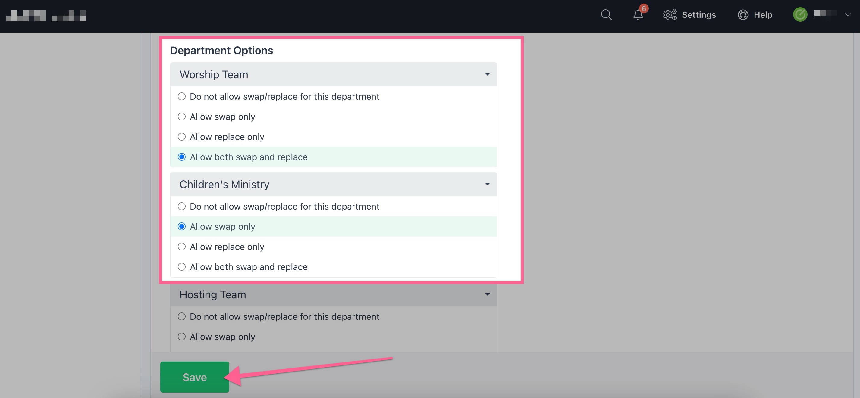 - Lastly, choose which Departments you would like to configure to accommodate swap and replace and click save at the bottom of the page.