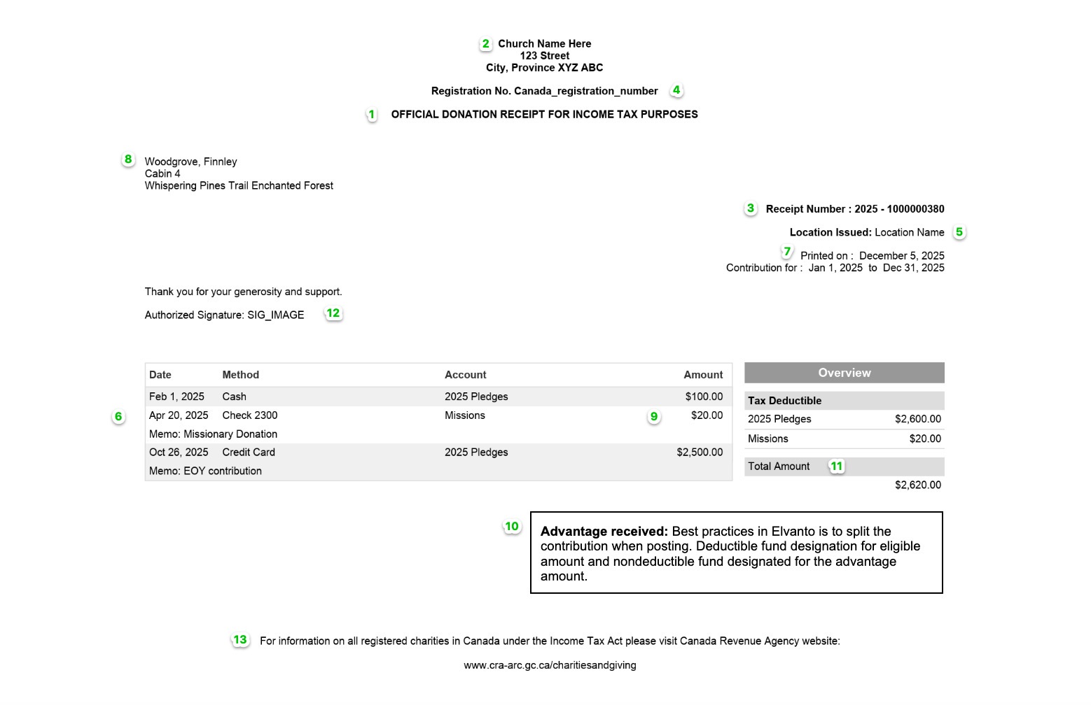1 The Receipt Number [%statement_year%] and [ %giving_number%] mail merge pulls from the statement year and profile giving number. For example, a statement from Jan 2025 - December 2025 for a profile with an assigned giving number of 1000000380 would look like this: 2025 - 1000000380.
