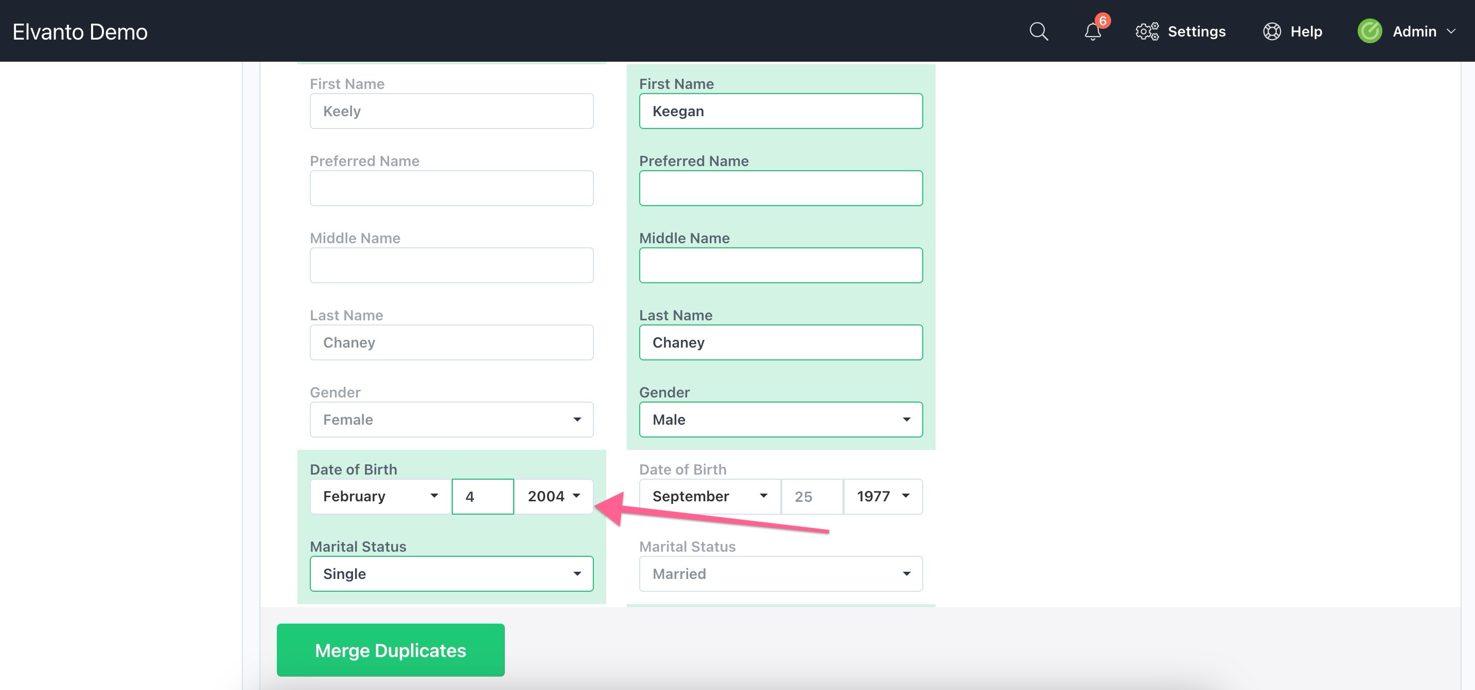 Once you are happy, click the green Merge Duplicates button at the bottom. If you have more than one person with a duplicate profile, you will automatically be taken to the next duplicate to make it quick and easy to merge all your duplicates at once.