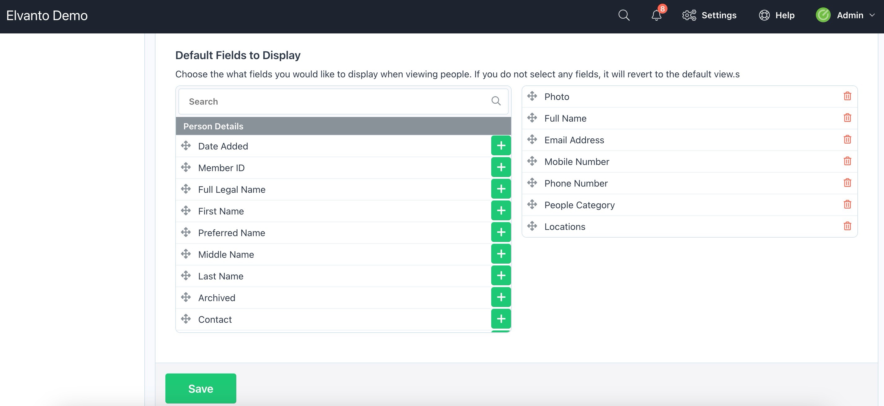 - Find the ‘Default Fields to Display’ heading – in this section, you can set the default columns to show for your account. All People Views will use this setting unless defined otherwise by the other methods below. Utilize 'drag and drop' to include and arrange your desired display fields within the right column.