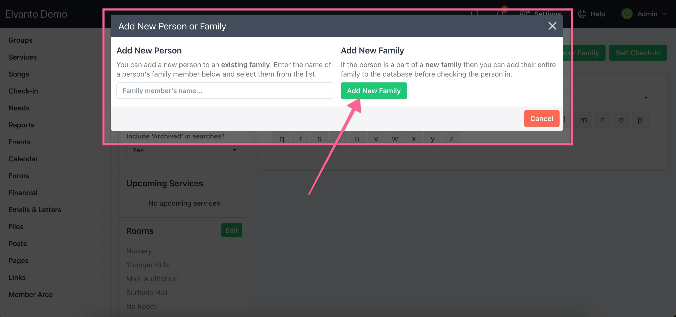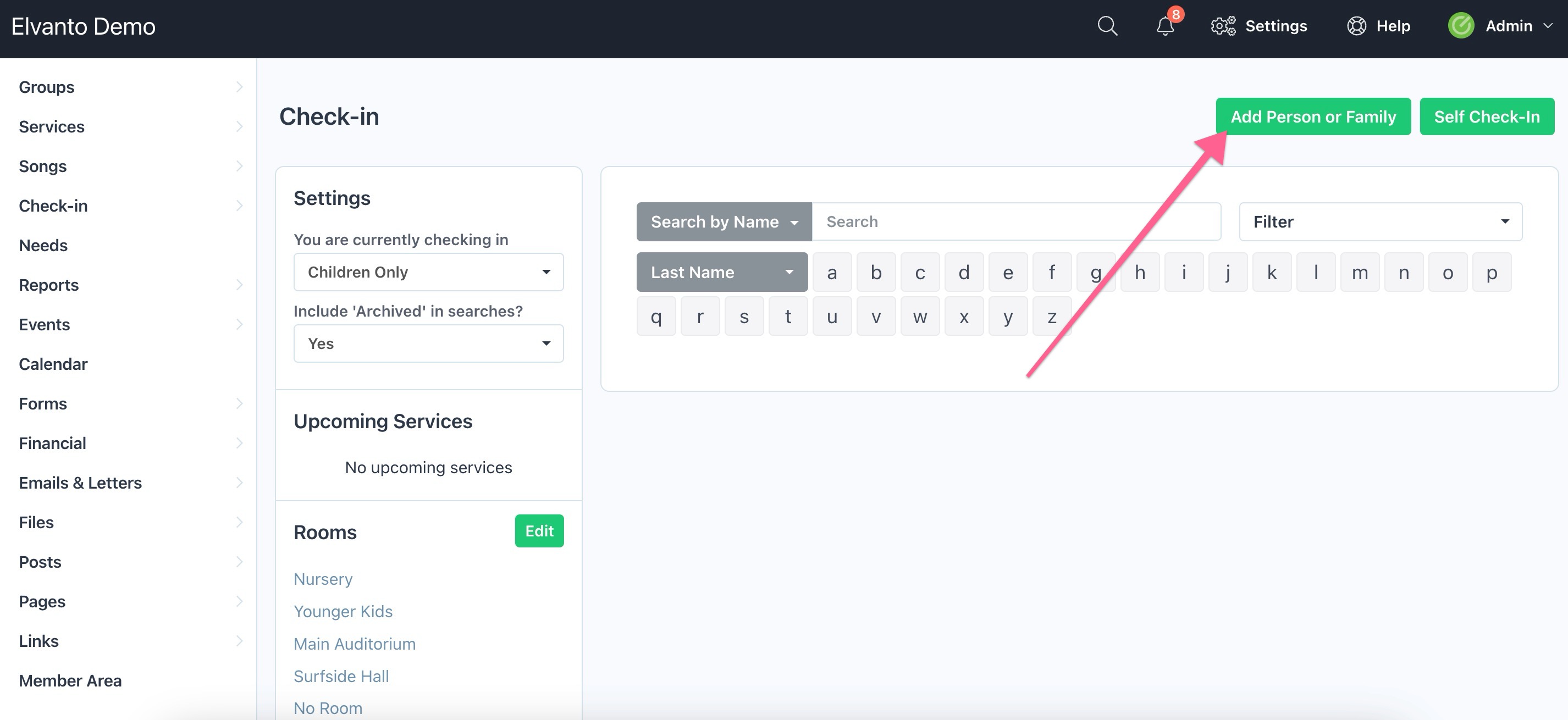 - Navigate to Services > Upcoming Services > select 'Check-In' for your current service. To add a new family, from the check-in page select the ‘Add Person or Family’ button.