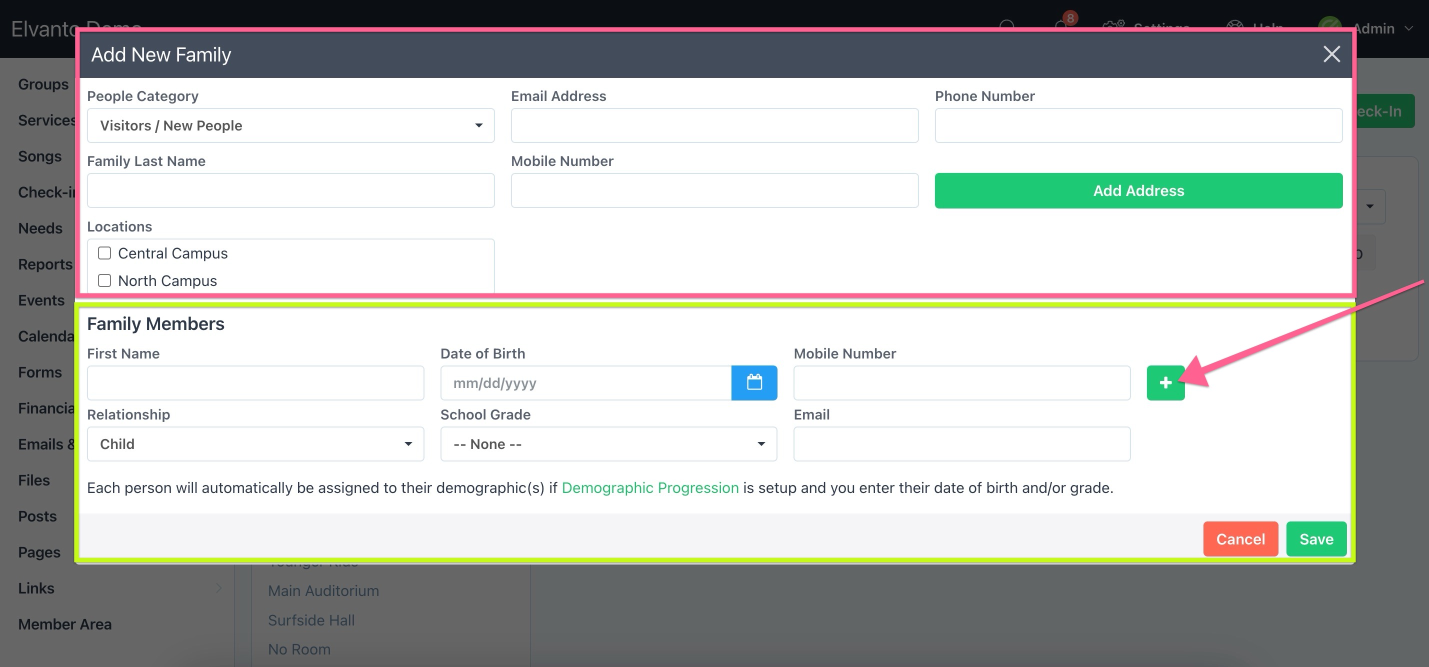 - During check-in, you can create a family for new members and guests that come on the day of a service. This allows you to add new contacts quickly into the system.